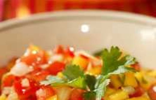 Ingredienser 1 st mango(s) 0,5 st gul lök(ar) 2 st röd chilifrukt 1 st vitlök(ar) 2 st tomat(er) 0,5 dl koriander , hackad 0,5 st limefrukt(er) , saften svartpeppar Tillagning 1. Skölj, skala och tärn [...]