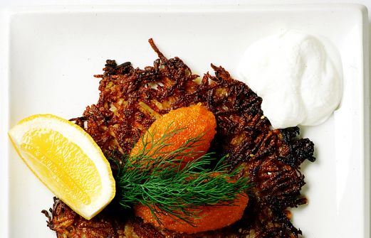 Antal portioner: 4 Ingredienser 200 g sikrom (eller rom från löja, lax eller stenbit) 8 medelstora råa skalade potatisar margarin till stekning 4 dillvippor 1 citron 2 1/2 dl gräddfil 2 hackade röd [...]