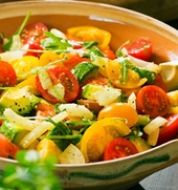 Världens enklaste sallad som Stella slukar. Strimla gurka och dela tomat. På med olivolja och äppelcidervinäger. Peppra och strö över flingsalt. Hacka ner färska kryddor om du har. Rör runt.