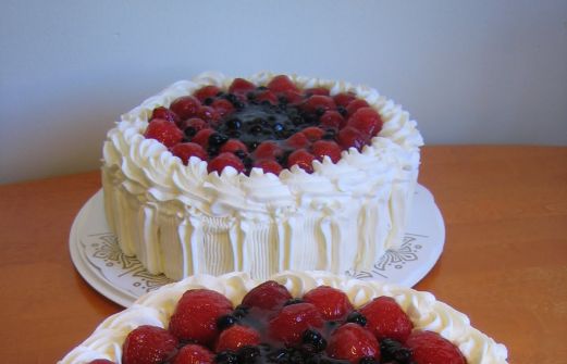 De här tårtorna tog vi med till ett födelsedagskalas vi var på idag. Ljus sockerkaka Vaniljmousse Jordgubbskvarg Täckt med jordgubbar, blåbär, gelé gjord på gelésocker, och grädde