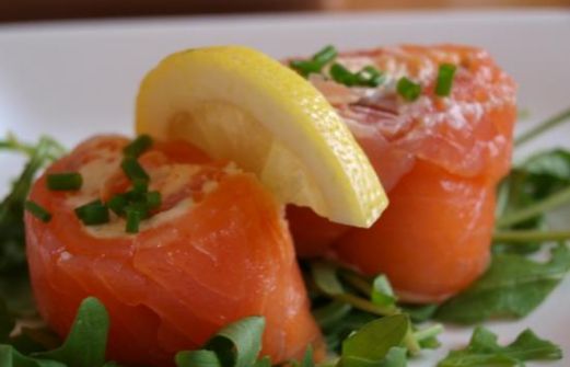 Ingredienser - 4 portionrt 300 g rökt lax i skivor 2 st gelatinblad 2,5 dl créme fraiche (15%) 1 krm vitpeppar 1 kruka gräslök 3 msk röd stenbitsrom 1 citron 2 msk lättmajonnäs 40 gram ruccola Tillagning Täck en bricka eller en skärbräda med aluminiumfolie eller plastfoli [...]