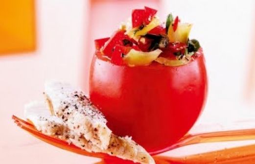 Ingredienser - 4 personer 4 stora tomater Salsa: 4 mellanstora, blandade tomater 1 gul eller röd paprika 1 rödlök 1 vitlöksklyfta 1 röd chili 1 liten bunt basilika 1 msk äppelcidervinäger 1 msk olivolja 4 kycklingfiléer Rapsolja Havssalt Nymalen svartpeppar 1 citron [...]