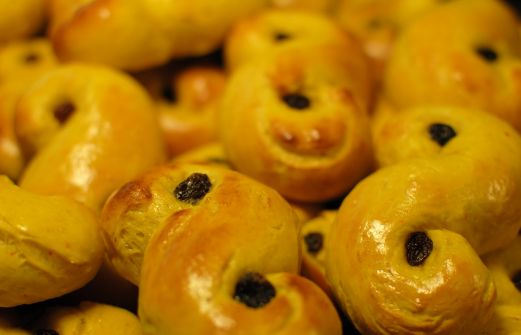 Goda små saffransbröd att fika på i decembermörkret. Alla måste äta dem på Lucia! ca 30 kusar 50g jäst 150g smör 5dl mjölk 1 burk kesella/kvarg (250g) 2 pkt saffran (á 0.5g) 1,5 dl socker 1/2 tsk salt ca 1,8 l vetemjöl russin 1 ägg Smula ner jästen i en degbunke. Smä [...]