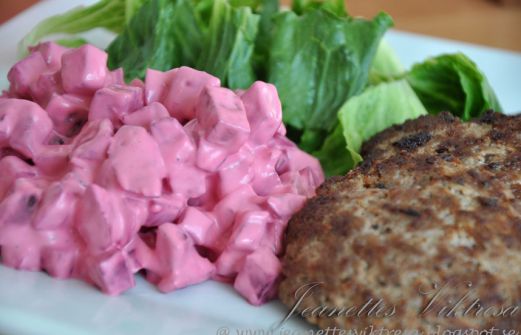 Biffar - 4 port 500-600 gram färs (bland eller lammfärs) 3 msk olivolja 1 tsk lökpulver 1 tsk örtkrydda salt och peppar smör eller kokosfett att steka i Rödbetssallad - 4 port 300-400 gram färska rödbetor 1.2 dl cremé fraiche eller majonäs Gör så här: [...]