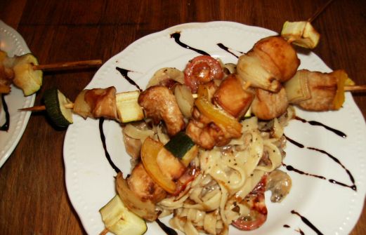 Pasta till 4 personer 250 g champinjoner 3 schalottenlökar 2,5 dl grädde 3 st soltorkade tomater Svartpeppar salt 500 g kycklingfilé 1 Zucchini 1 paprika 1 gul lök 100 g cocktailtomater 2 dl balsamvinäger 1/2 dl flytande honung 8 grillpinnar Gör [...]