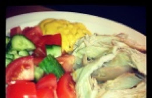 Ca 1/2 grillad kyckling 1 tomat 10 cm gurka 1,5 dl mango raja dressing