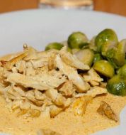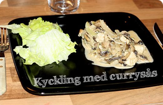 Tisdagsmiddagen. Lite trist sallad till, vi mÃ¥ste Ã¥ka och handla. (Barnen fick ris ocksÃ¥.) Kyckling i currysÃ¥s med lök och svamp (4 portioner) 600 g kycklingfilé Smör (till stekning) 500 g champinjoner 3 gula lökar Olja (till stekning) 2–3 dl vispgrädde 2 msk currypasta [...]
