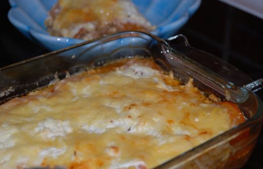 köttfärssås (lök, köttfärs, soja, buljongtärning, Piffi allkrydda, creme fraiche, salt, peppar) I med lite pastatomatsås, 2 msk tomat& fetaostmjukost. Stek ihop med 2 ägg och lägg sedan i gratängform. På med skivade tomater, riven fetaost, riven ost. Gratinera 20 minuter.