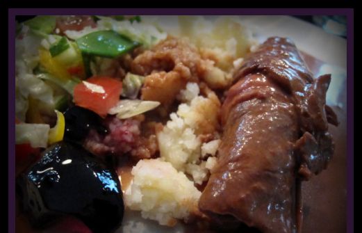 Receptet är taget från Per Moberg. 4 port. 600 g (8 skivor) tunt skivat oxytterlår eller -innanlår 1 st morot 1 st gul lök 2 msk fransk senap 100 g bacon 50 g cornichoner 1 l oxbuljong 2 msk tomatpuré salt och peppar Gräddsås: buljongen från rulladerna 3 dl visp [...]