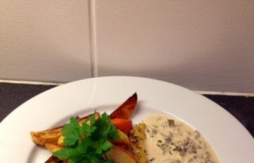 Enkelt men ack så gott. Köpte färdig marinerad kycklingfilé och till det rostade rotfrukter samt sås på trattkantareller och en burk crémefraich
