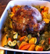 En saftig kyckling med krispig yta som tillagas i ugnen med både potatis och grönsaker. Serveras med en gräddig och smakrig sås. Kräver lite tid för förberedelse men är samtidigt enkel då hela rätten sköter sig själv i ugnen. 4 port 1 hel färsk kyckling 4 näv [...]