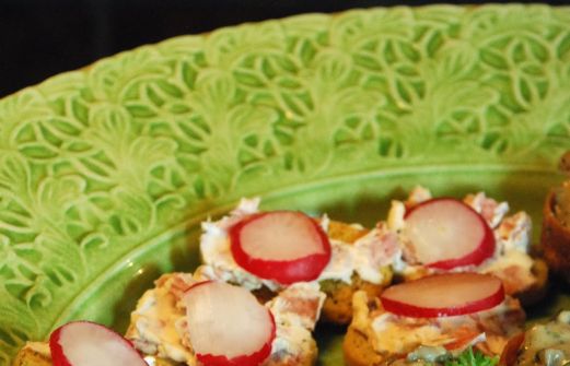 Goda tilltugg. Crostini med salamiröra 0,5 burk Creme bonjour gräslök 5 salamiskivor rädisor crostini Blanda färskosten med strimlad salami. Bred pÃ¥ crostini och lägg pÃ¥ en skiva rädisa. Servera pÃ¥ dirren. (Mitt bästa recept) -Mama Skogly ♥