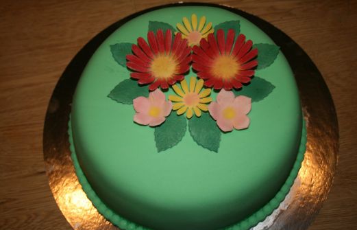 Då var dagens tårta klar. Den ska till Pårydskolan, så jag hoppas de blir nöjda:) Den är fylld med hallon/blåbärsmousse och vaniljmousse. Blommorna är som vanligt gjorda av FP och jag täckte tårtan med Ballinas sugarpaste..