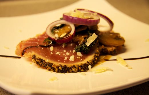 Fram med grovmalen svartpeppar, sesamfrö, vallmofrö och salt..Rulla tonfisken i denna mix.Värm stekpannan å släng på litta smör och olja..stek tonfiken runt om. Gör en gojs på dijonsenap, svartpeppar, olja och balsamico...mmmmm smaka smaka;) Skiva champinjoner stek i smör sen tillsätt färsk spi [...]