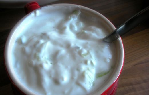 1l Mild Naturell Yoghurt ½ Riven gurka 3 Pressade vitlöksklyftor Lite Grovmalen Svartpeppar