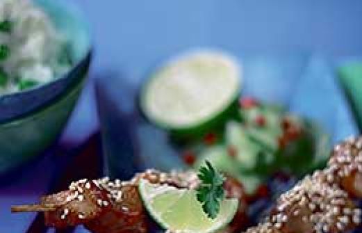 Snabblagade kycklingspett med hjälp av färdigköpt Teriyaki-sås. Sesamfröna på toppen ser festligt ut. Bild lånad från DN 4 pers 4 kycklingfiléer 1 dl Teriyaki-sås 1/2 purjolök 1 röd paprika 1 grön paprika Sesamfrön 1. Skär kycklingfiléerna på längden i 3 delar. Trä upp på spett. 2. Krydda med s [...]
