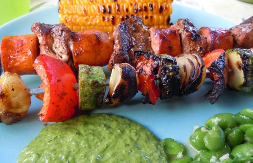 Till den goda basilikasåsen och dom smörstekta bondbönorna som jag gjorde häromdagen blev det grillspett med diverse godsaker på. På "köttspetten" hade vi grytbitar ifrån gris och chorizokorv. På grönsaksspetten blev det squash (egenodlad), röd paprika och gul lök (egenodlad). Grytbitarna fick [...]