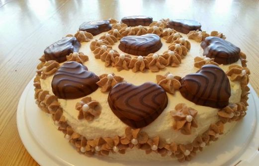 * 1 hembakad nötbotten * 1 köpt marängbotten * Fyllning: Mintchoklad fluff * Spacklad med: Grädde * Dekorerad med: spritsad mintchokladfluff, sockerpärlor och köpta geisha kakor