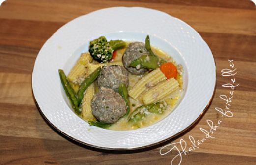 Thai frikadeller (4 portioner) 500 gram nötfärs 1 msk riven färsk ingefära 1-2 vitlöksklyftor 1 ägg 0,5 dl grädde 0,5 dl hackad färsk koriender Salt & peppar 1 burk kokosmjölk 2 tsk röd currypasta 2 tsk fisksås 1 msk äkta honung* 2 morötter 1 ask minimajs 1 näve broccolibukett [...]