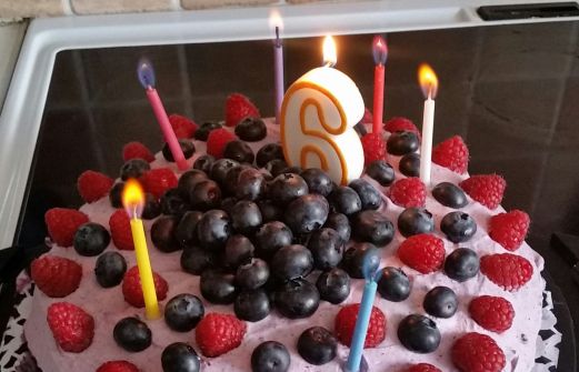 Syrrans sommartårta Färdiga Sockerkaksbotten Vispgrädde Vaniljkräm Blåbärsylt Färska blåbär och hallon Första botten: bred blåbärsylt Andra botten: vispade ganska tjock vaniljkräm (finns förpackning) Tredje botten: vispade grädde med blåbärsylt så blir lila färg. [...]