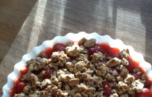 En smak av sommar... Jordgubbar 3/4 dl muscovadosocker 1 msk majsstärkelse Knyt ihop; 75 grovhackade pecannötter 100 gr mjukt smör 1 dl muscovadosocker 1 tsk bakpulver Nypa salt 2 dl mjöl 200 gr i 25 minuter