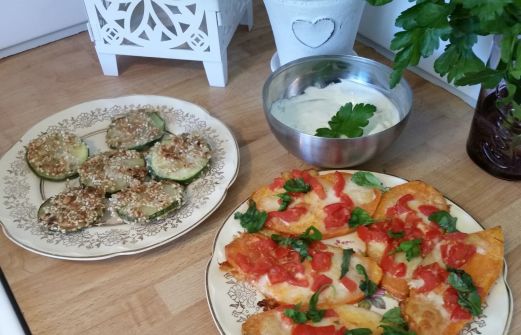1 stor sötpotatis Smör, olivolja Grovsalt 2-3 dl riven Mozzarella ost 6-8 små skivad tomater. Vitlöksåsen: 2 dl creme fraiche 2 st pressade vitlök Aromatkrydda Blanda ihop. Ha till sallad också.