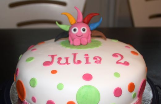 Lilla Julia fyller 2 år och hon älskar bollar och babblarna, så detta blev önskemålet till födelsedagstårtan. Tårtan består av glutenfria ljusa bottnar, fylld med jordgubbsmousse, jordgubbssylt och gräddvaniljkräm. Dek med sugarpaste. Stort Grattis på födelsedagen [...]
