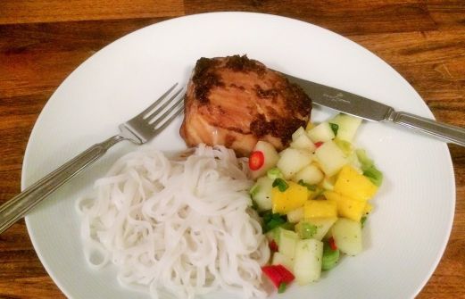 En fräsch fiskrätt när du känner för något asiatiskt. Torsken serveras med risnudlar och en salsa med mango och melon.