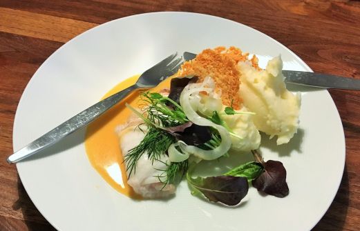 En festlig fiskrätt som serveras med potatismos eller pressad potatis.