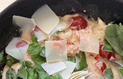 En favoriträtt är denna goda pasta som vi ofta gör här hemma. Pasta 300 gr skalade räkor 1 vitlöksklyfta 1 ask romanticatomater 2 salladslökar olivolja 2 dl vispgrädde 40% 1 dl vatten saften av 1/2 lime salt och peppar Parmesanost Koka pastan Stek vitlöken lätt i olivolja, häll i grädde, vatten [...]