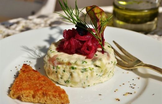 8 potatisar av fast sort (gärna Amadine) 1 gelatinblad 1,5 dl crème fraiche Salt Peppar Lite honung 1 liten ask anjovisfiléer 2 msk dill 2 msk gräslök 2 dl kryddpepparost eller annan smakrik ost Rödlöksmarmelad: 2 rödlökar i tunna skivor 1 dl vitvinsvinäger 1 nypa socker Salt & svartpep [...]