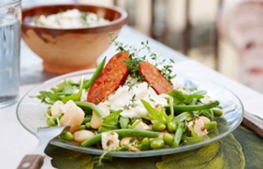 Ingredienser 100 g haricots verts 3 dl stora vita bönor 250 g soja bönor , tinade 1 liter blandad sallad 1 burk Arla Apetina ® vitost herbes de Provence flingsalt Löktsatsiki 2 färska lökar 1 ⁄ 2 tsk salt 2 dl Arla Köket ® matyoghurt 2 msk hackad timjan [...]
