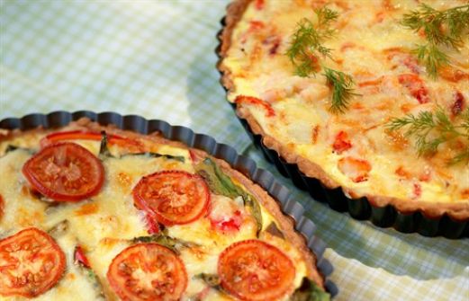 Pajdeg: (räcker till 2 formar 20 cm diam.) 150 g Smör 1/2 dl mjölk 3% 1 äggula 4 dl mjöl 1/2 tsk salt Äggstanning: 3 ägg 2 1/2 dl Matlagningsgrädde 1/2 tsk salt 1/2 krm vitpeppar Vegetarisk fyllning: 1 gul lök 2 röda paprikor 2 tomater 40 g färsk bladspenat 3 dl riven ost, Allerum Präst Sk [...]