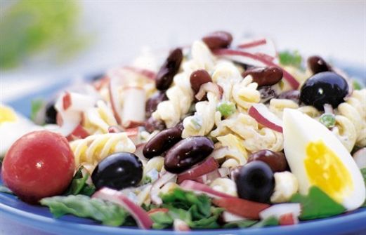 4 dl kokt pasta, gärna snäckor eller spiraler 1/2 röd lök 1 grön eller gul paprika 1 burk röda bönor 1 dl gröna ärter 200 g färsk spenat eller grönsallad Sweet chilidressing: 2 dl Lätt Crème Fraiche 1 msk ketchup 1 msk sweet chilisås salt och peppar Till garnering: 2 hårdkokta ägg 10 grovha [...]