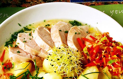 Antal portioner: 4 Ingredienser Buljong: 1 kyckling 1 1/4 liter vatten 1/2 purjolök 2 morötter 1 gul lök Soppa: 3 dl grädde 1 morot 1/2 purjolök 1/2 [...]