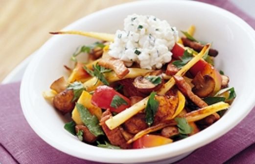 Ingredienser 200 g rökt fläsk 400 g palsternackor 200 g champinjoner 1 st äpple Svenskt Smör frÃ¥n Arla 1 ⁄ 2 tsk salt 1 krm svartpeppar 1 ⁄ 2 dl grovhackad färsk persilja 250 g KESO ® cottage cheese Gör så här: Strimla köttet. Skala och striml [...]
