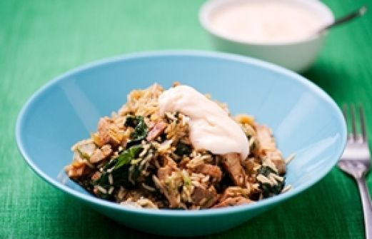 Ingredienser 400 g stekt fläskkött t ex fläskkotlett eller karré, eller kyckling 1 st gul lök 400 g salladskål 1 msk rapsolja 100 g bladspenat 3 dl kokt kallt ris 3 msk japansk soja 2 msk tomatpuré 1 ⁄ 2 tsk salt 1 ⁄ 2 tsk svartpeppar Sås: 2 dl Arla Köket &r [...]