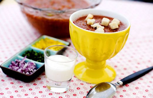 Antal portioner: 4 Ingredienser 4 dl buljong 2 dl olivolja 3 dl tomatjuice 2 st vitlöksklyftor 1 st gul lök 1 st gurka 2 st paprikor 1 st tomat 1 tsk socker sambal o [...]