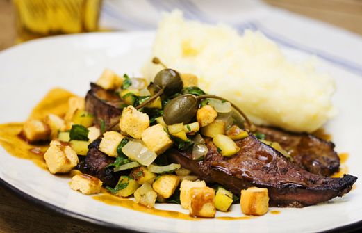 Antal portioner: 4 Färdigt på: 20 min Ingredienser 4 skivor kalvlever à ca 150 g 1 st gul lök 1 st äpple 4 tsk kapris 2 msk sherryvinager 1 knippa persilja 1 dl brödkrutonger 1 st köttb [...]